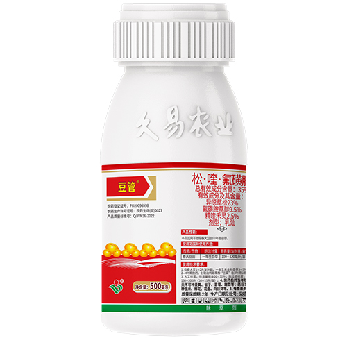 | 使用技術 | 1.在春大豆1-2片復葉期,一年生禾本科雜草3-5葉期,闊葉雜草2-4葉期施藥。 2.防治鴨跖草和“三菜”在3葉期以前使用效果最好。 3.人工噴霧,噴液量每畝20-30升;4.施藥后的當年秋天或次年春天不可種麥類、谷子、苜蓿、甜菜等;藥后次年春天可以種玉米、棉花、花生、向日葵等。 5.每季最多使用1次。 |